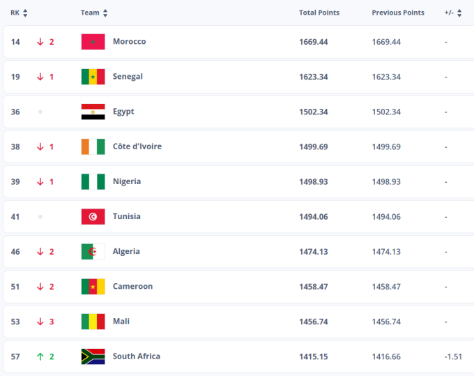 The 36th-placed spot keeps Egypt as the third-highest-ranked team in Africa behind Morocco, who still remains top of the continent despite falling two places down to 14th. Senegal comes in third place in the 19th spot.