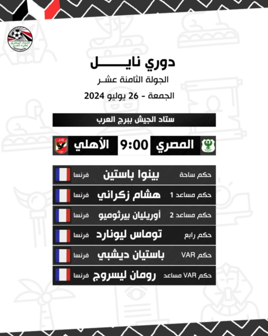 The Egyptian Football Association announced that 41-year-old French referee Benoit Bastien will take charge of the Al Ahly vs Al Masry clash on Friday.