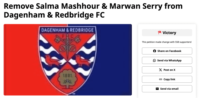 British website Jewish News first reported on the posts. A petition demanding the duo’s removal was launched on Change.org, local sponsors expressed concern, and club executives began to rethink the appointment. Despite Mashhour insisting her message was one of empathy and context, Dagenham, Salma, and Marwan Serry found themselves pulled into a volatile intersection of football, politics, and online outrage.