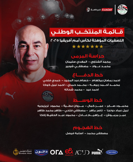 Egypt manager Hossam Hassan has announced a 25-man squad for the upcoming matches against Cape Verde and Botswana in the 2025 Africa Cup of Nations qualifiers.